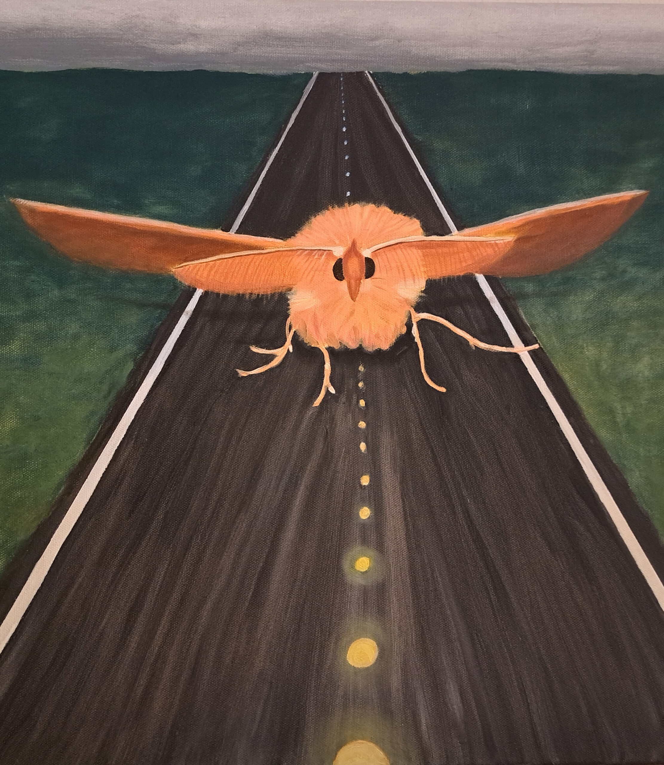 Katarina Lindroth har varit medlem i föreningen i ett par år och påbörjade sitt konstnärskap med akryl och har sedan även utforskat oljan via kurser på Folkuniversitetet. Hennes konst innehåller ofta en komisk twist, är öppna för egen tolkning eller förmedlar budskap.